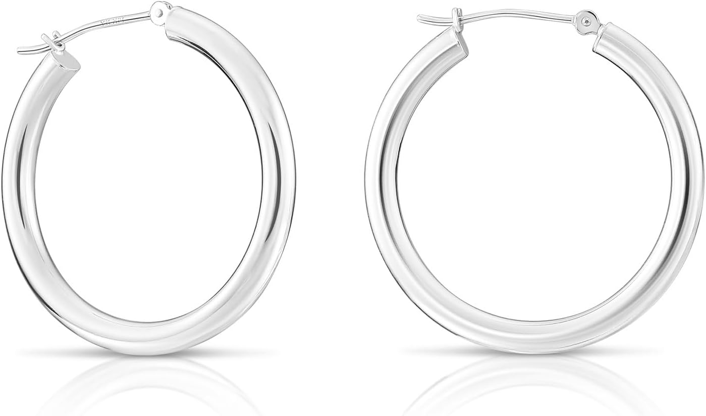 14K White Gold Classic Chunky Hoop Earrings, Solid White Gold Chunky and Lightweight Shiny Hoops, 3mm Tube Thickness