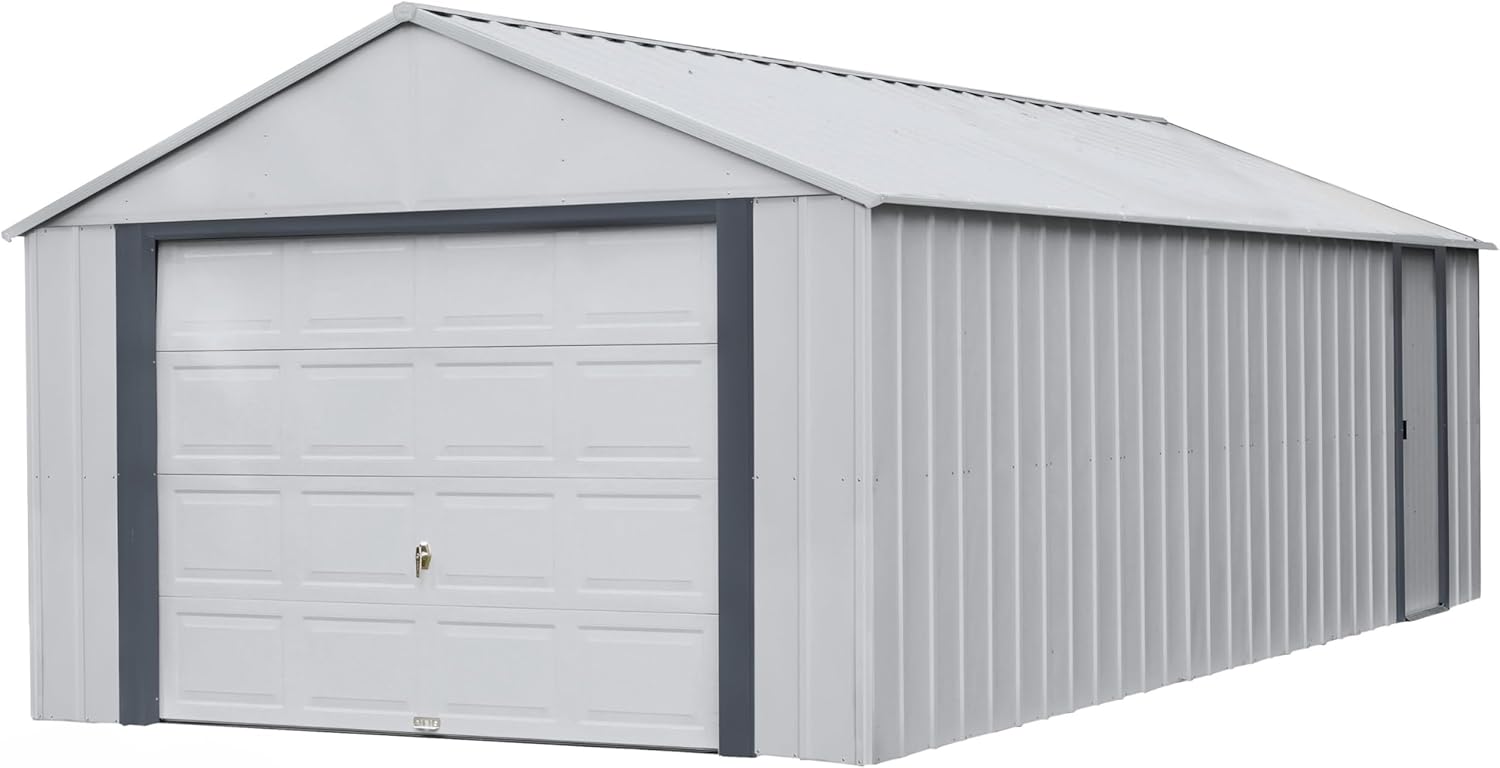 Add functional storage space to your property with the Arrow Murryhill Garage Storage Building. It features tall 73.75" walls topped with a high-gable roof for ample headroom and to ensure tall items and vertical storage shelves are never a problem. If you're storing wide or bulky items like a car, boat, or lawn equipment, you'll appreciate the extra wide 95 x 72 inch roll-up door.In addition to storage, the Murryhill Garage makes a spacious and affordable workshop for all kinds of projects. It provides plenty of room for tool benches, woodworking tools, and automotive equipment. The convenient, sliding side-entry door is 24. 25 x 71. 25 inches and makes it easy to walk in and out of the garage without having to open the roll-up door. Its detached design also means you can work in the garage at any time day or night without disturbing family members or neighbors.The Murryhill Garage is made from strong, durable galvanized steel. A metal handle can be attached on the front of the garage door to provide an easy opening and closing of the door.Not only is it sturdy, functional, and built to last, the Murryhill Garage is designed to add aesthetic appeal to your property. It has a neutral Flute Gray finish with Anthracite trim to effortlessly complement your home and yard. It pairs seamlessly with a wide range of home colors- at a fraction of the price of a brick and mortar structure.The Murryhill Garage comes ready to assemble with pre-cut and pre-drilled parts. We recommend at least 2-3 people for assembly and to set aside at least 8+ hours.For the sturdiest assembly, it is recommended that you secure the structure to a concrete pad. Anchoring and base materials are not included with your building. We recommend the use of an Arrow Anchoring Kit as an effective method of securing your building to the ground (search ASIN: B000IXPYPA).Proudly made in the USA.ASSEMBLED DIMENSIONS: 10' L x 12' W x 8. 5' HINCLUDES:SteelHardwareGarage DoorManualFasteners