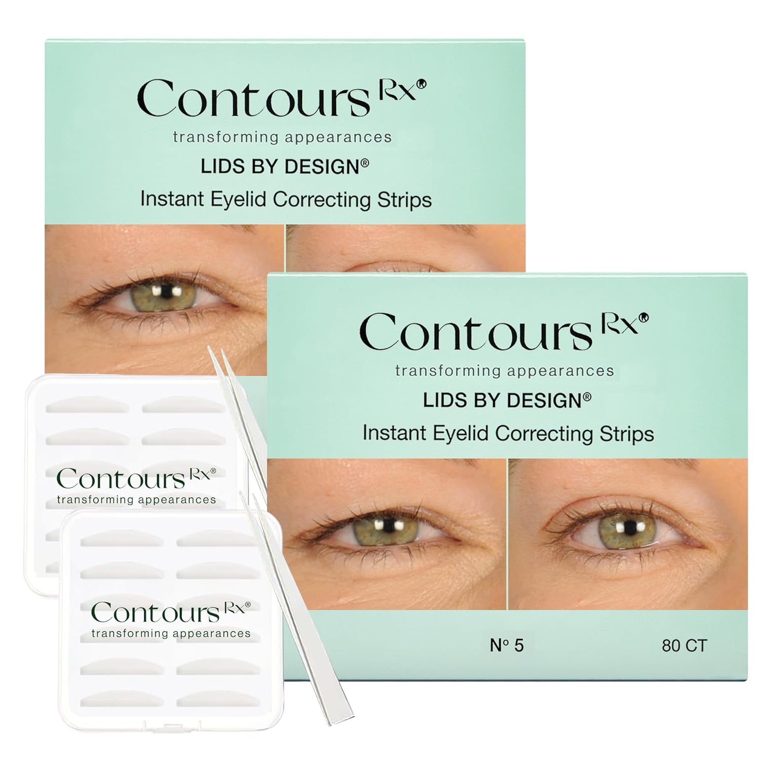 • CONTOURS RX QUALITY - Lids by Design eyelid tape assortment pack comes with 4 different sizes–a subtle 4mm size to a more dramatic 7mm size in look and eyelid definition. Correcting eyelid strips include 80 strips, a months supply of relief from heavy hooding, excess skin, and tired looking eyes. Each set comes with tweezers for a fast and smooth application.