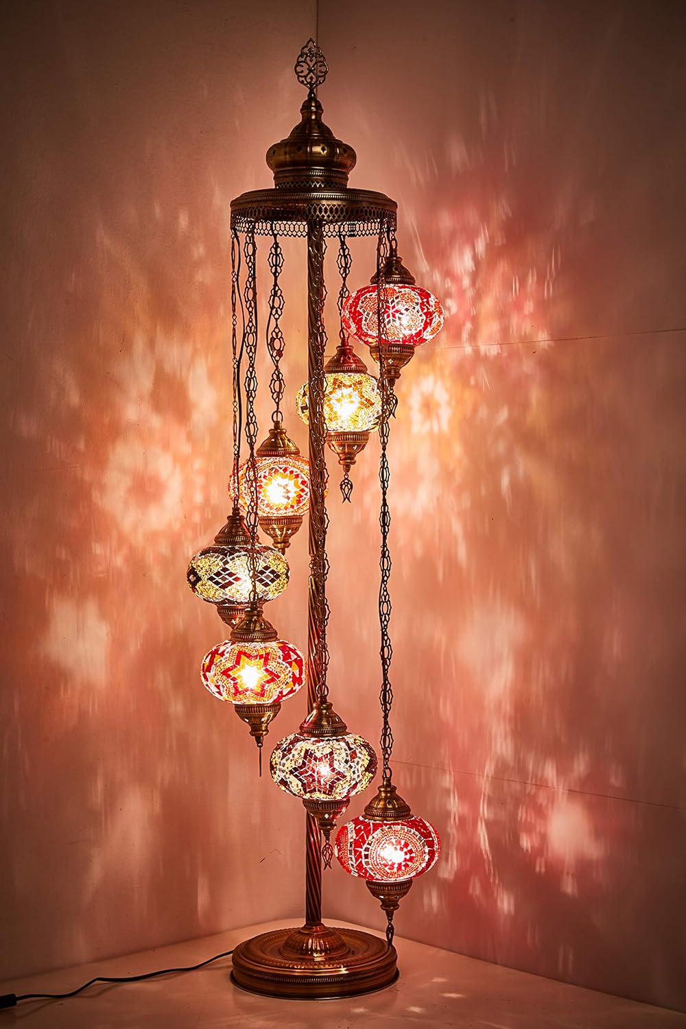 Turkish Moroccan Floor Lamp with 7 Big Size Globes. 5feet Height. US PLUG. E12 US SOCKET. On/Off Switch. HEIGHT:59" Globe Diameter: 6.5". 100% Handmade in Turkey. Antique Brass Color Body. Decorated Chains. A Unique Gift, A Conversation Piece That Will Change the Atmosphere of Your Place & Mesmerize Your Guests. Needs North American Type Small Candelebra LED Bulbs (E12, C7 etc. - Bulbs NOT Included).