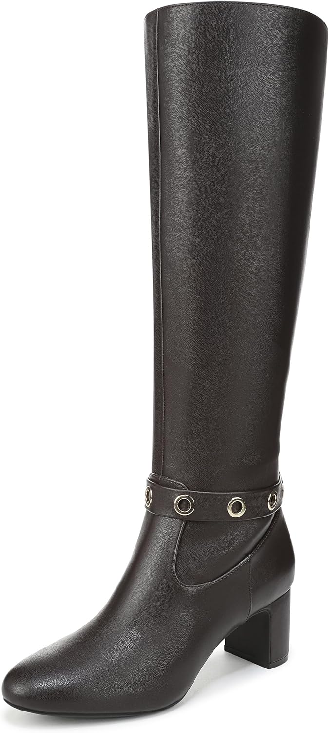Get that comfortable, classic feel with a hint of edge in these stunning women’s tall boots. Faux leather upper with an almond toe, side zip, and wraparound strap with metallic grommet detailing. Trusted Soft System® comfort technology for unmatched cushion, support, and flexibility in every pair. 15 1/4 inch boot height, 14 1/2 inch calf circumference. Note: Measurements based on size 6 boot. For each half size larger, shaft height increases by . 12 in, circumference by . 20 in. Just Right Height 2 3/8 inch heel.