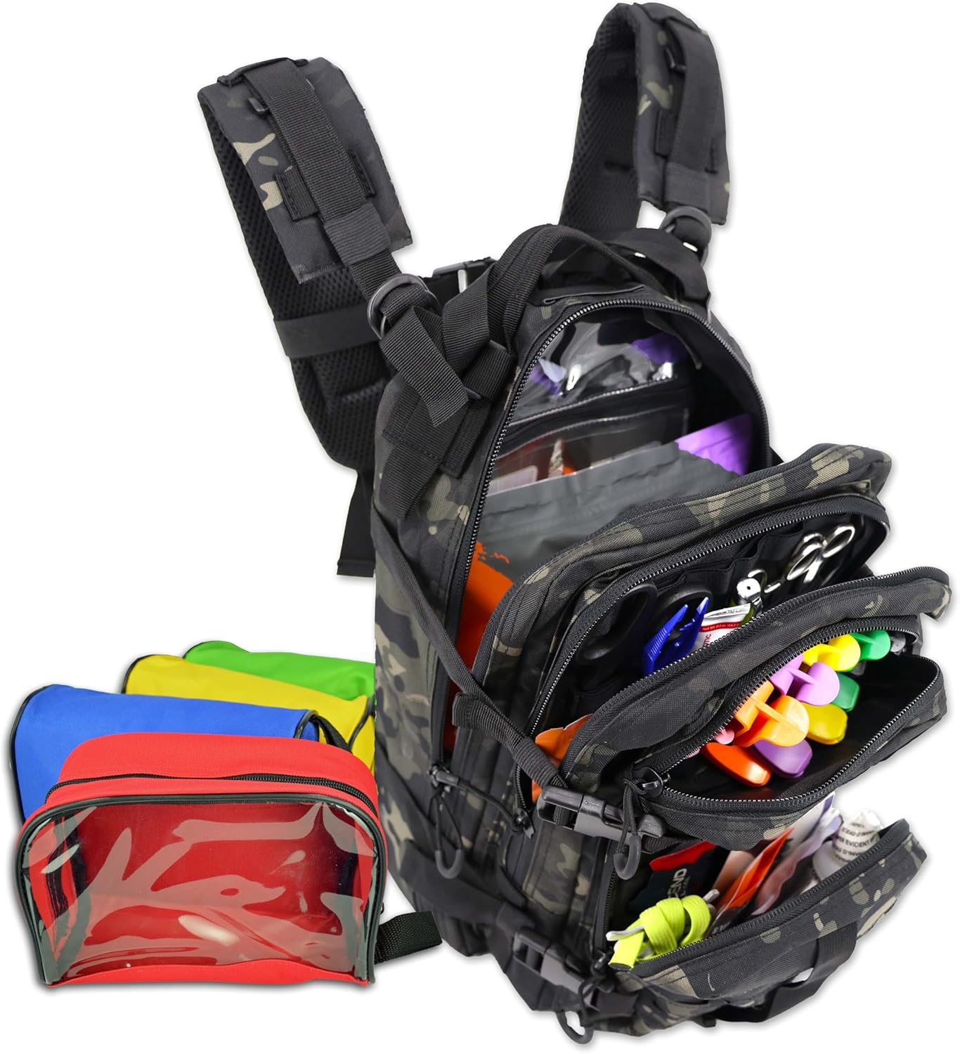 The LXPB89 is a compact backpack style first responder kit featuring four main exterior compartments plus a quick access compartment behind the lumbar panel. The front, sides and bottom feature modular (MOLLE) loops for attaching extra gear. The shoulder straps are completely adjustable from all points to accommodate different body types and also feature a chest strap, and webbing loops to hold a drinking tube. The rear of the bag is designed with padded mesh lumbar panels to make long periods of wear more comfortable on your back. Inside the main two compartments are smaller mesh panels that are perfect for organizing your gear and keeping items separated. Every opening consists of extra large dual zippers with corded zipper pulls for easy opening and closing of compartments. Our kit comes stocked with the following items: ● Tweezers ● Kelly Hemostats ● Trauma Sheers ● Bandage Sheers ●LED Penlight ● Ammonia (10) ● Heavy-Duty Adhesive Bandages (100 assorted sizes) ● 4" x 4" Gauze Pads (50) ● 2" Roll Gauze (2) ● 3" Roll Gauze (2) ● 4" Roll Gauze (2) ● 2" Self-Adherent Bandage (2) ● 2" Elastic Ace Bandage (2) ● 5" x 9" ABD Pad (2) ● 8" x 10" ABD Pad (2) ● 1" Roll Cloth Tape ● Iodine Wipes (10) ● Isopropyl Alcohol Wipes (10) ● Triple Antibiotic Ointment 1/2 oz ● Instant Cold Packs (2) ● Eye Pads (2) ● Triangle Bandage (2) ● Eye Wash Irrigation Solution ● Nitrile Exam Gloves (4) ● Universal SAM Finger Splint ● Oral Glucose Gel ● Adult Blood Pressure Cuff w/ Case ● Sprague Stethoscope ● CPR Mask ● Berman Airway Kit (6 sizes) ● Sting & Bite Relief Swabs (10), 4" x 4" Burn Dressing (2) ● First Aid Guide ● Quick Clotting Hemostat Gauze 4" x 4" (2) ● Dyna-Stopper Trauma Pressure Dressing ● 12" x 30" Multi-Trauma Pad ● Compressed Z-folded Gauze 4.5" x 4.1yd ● Israeli Pressure Bandage 4" ● First Aid Spray 2oz ● Burn Spray 2oz ● CPR Set ● 36" Roll Splint ● Emergency Mylar Blanket ● Color-Coded Pouches (4)