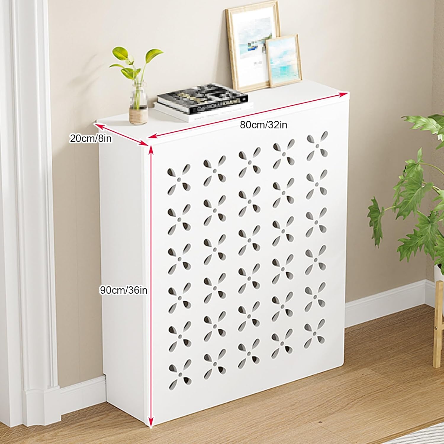 Transform your space by hiding old or unwanted radiators with this beautifully designed radiator cover.The radiator cover is painted in modern white, which matches perfectly with any home decoration style. The sturdy and durable radiator cabinet is made of durable PVC wood-plastic board. It is waterproof, moisture-proof, high temperature resistant, not easy to deform, and the service life can reach more than 5 years.The radiator cover adopts mortise and tenon structure, saying goodbye to the complicated assembly process.♦ Product details:- Name: Heater Covers- Main material: PVC Wood Plastic Board- Color: White- Product Dimension ( W * H * T): 60x70x15cm/24x28x6in , 60x70x20cm/24x28x8in , 60x70x25cm/24x28x10in , 70x70x15cm/28x28x6in , 70x70x20cm/28x28x8in , 70x70x25cm/28x28x10in , 70x80x15cm/28x32x6in , 70x80x20cm/28x32x8in , 70x80x25cm/28x32x10in , 80x80x15cm/32x32x6in , 80x80x20cm/32x32x8in , 80x80x25cm/32x32x10in , 80x90x15cm/32x36x6in , 80x90x20cm/32x36x8in , 80x90x25cm/32x36x10in , 90x80x15cm/36x32x6in , 90x80x20cm/36x32x8in , 90x80x25cm/36x32x10in , 90x90x15cm/36x36x6in , 90x90x20cm/36x36x8in , 90x90x25cm/36x36x10in , 100x80x15cm/40x32x6in , 100x80x20cm/40x32x8in , 100x80x25cm/40x32x10in , 100x90x15cm/40x36x6in , 100x90x20cm/40x36x8in , 100x90x25cm/40x36x10in- Room: Living room, any room- Product Care Instructions: Wipe with a Damp Cloth♦ Package Included:Radiator Cover × 1(Front*1+Top*1+Side*2)All Accessories for Installation & Instruction manual