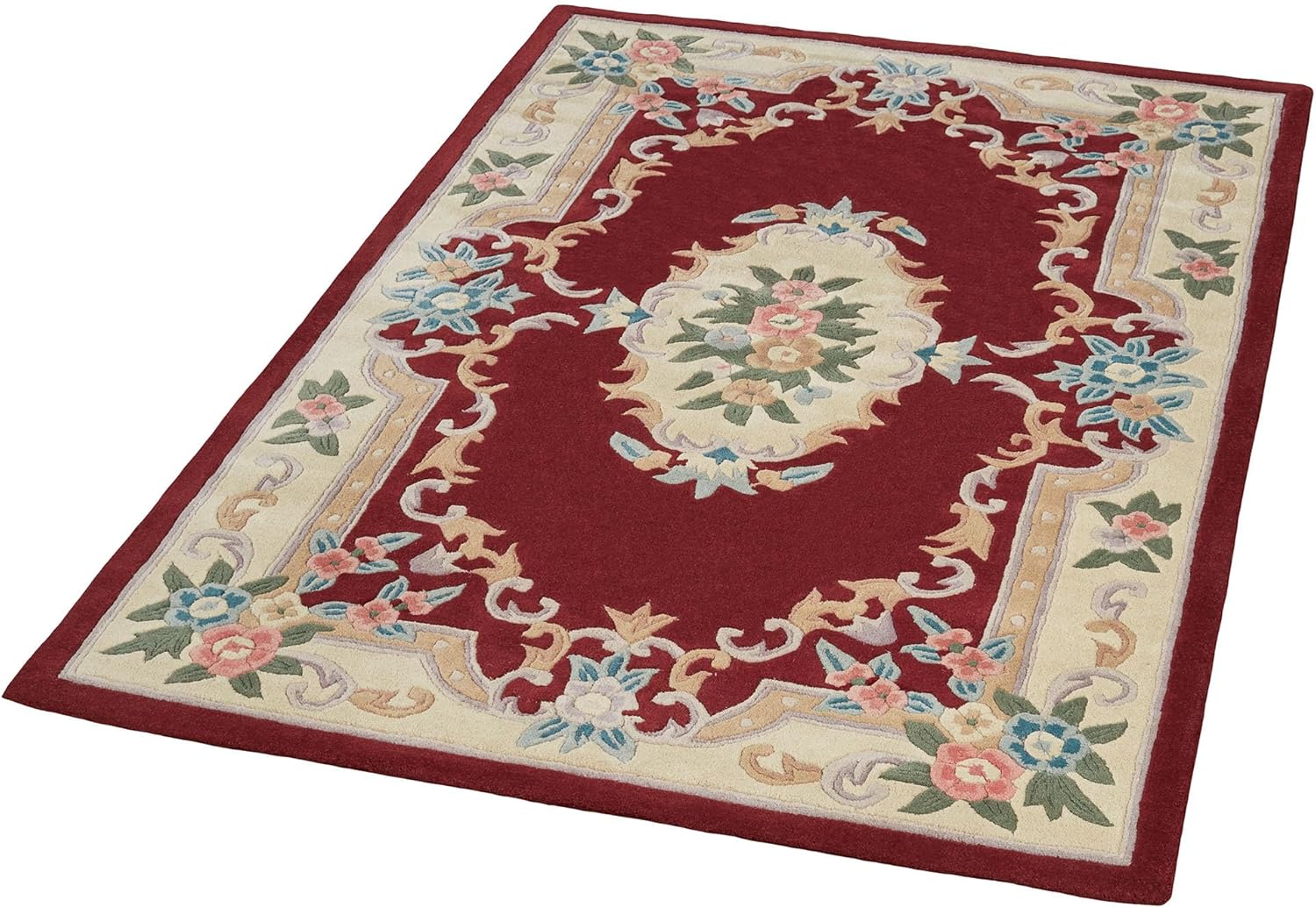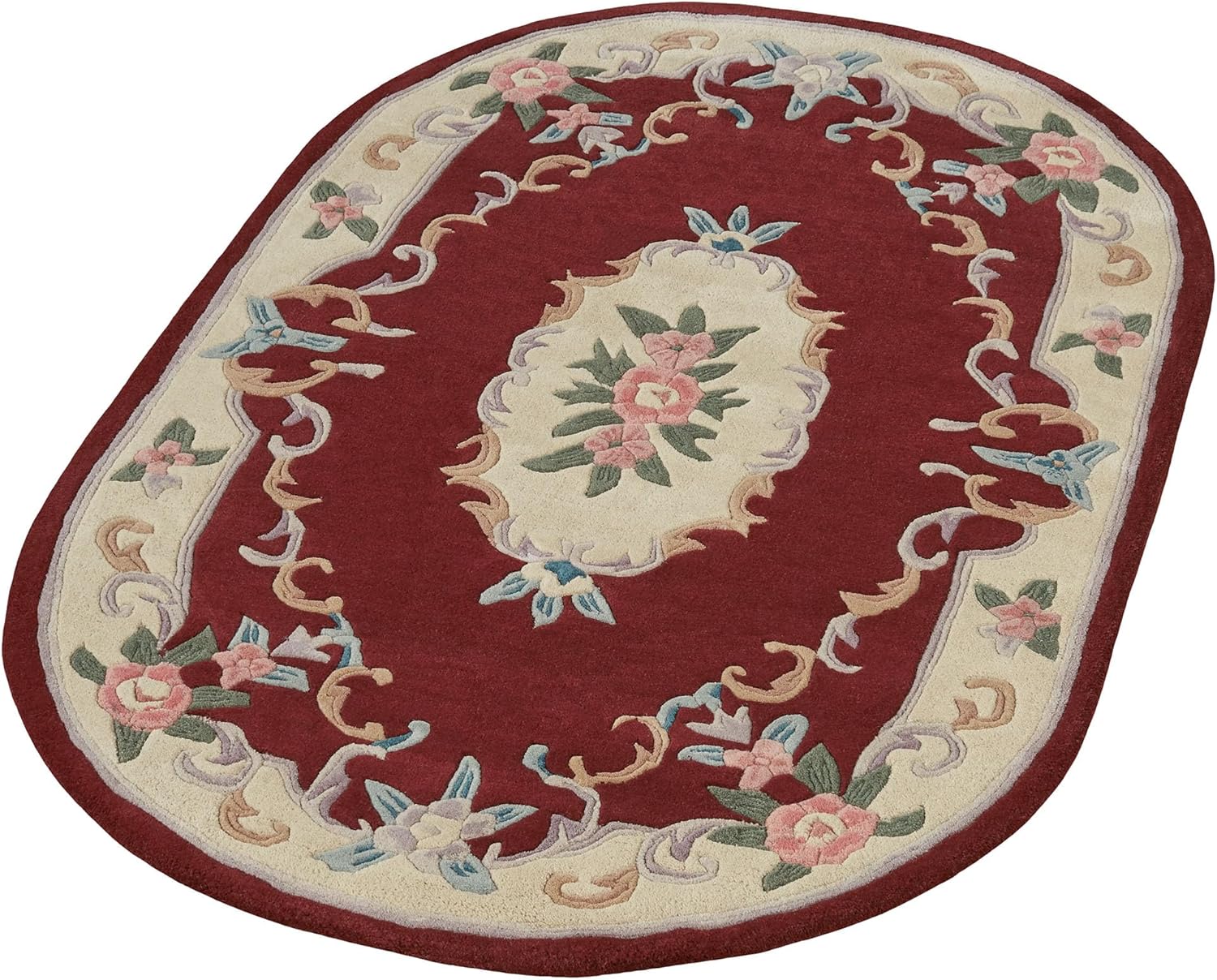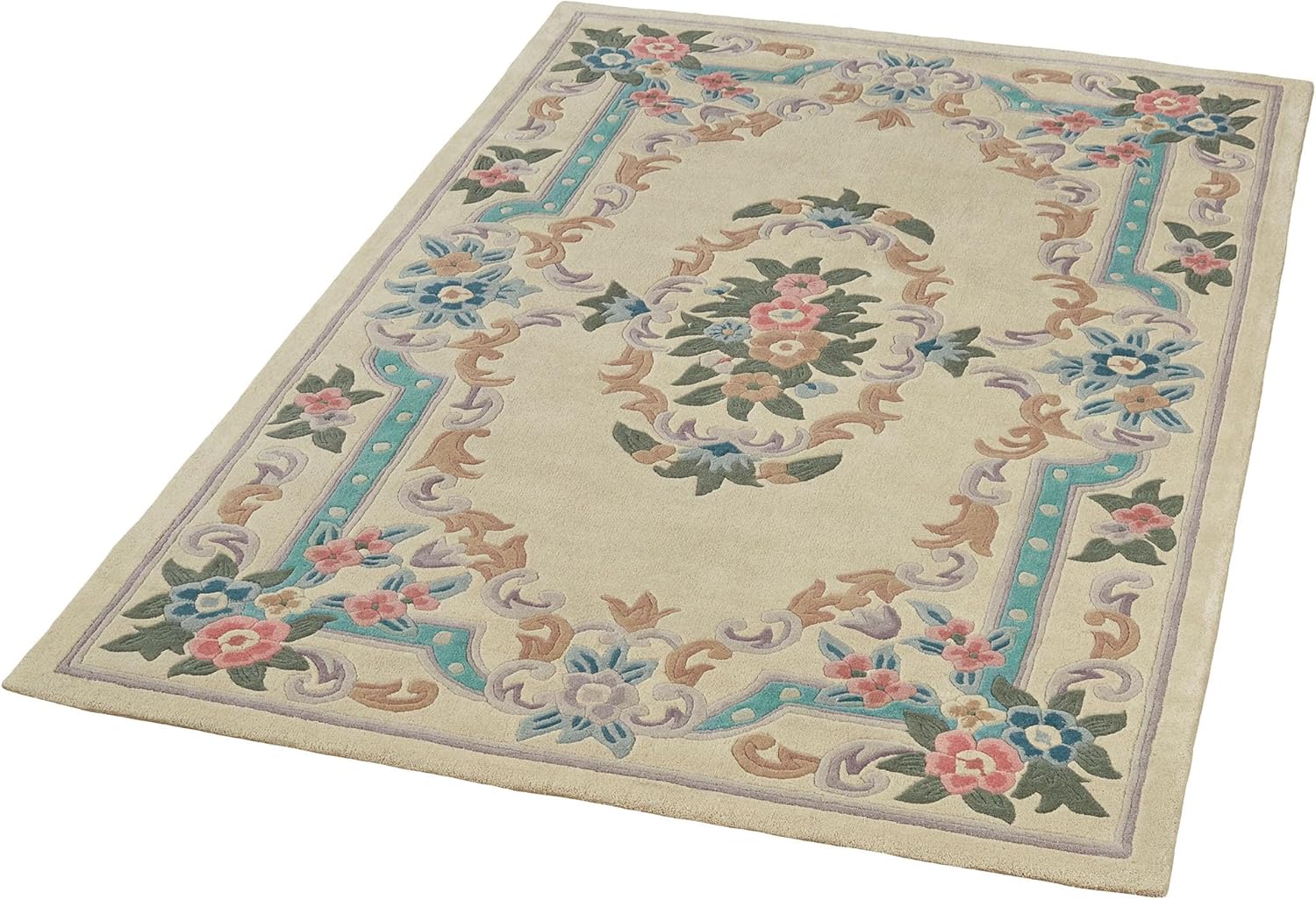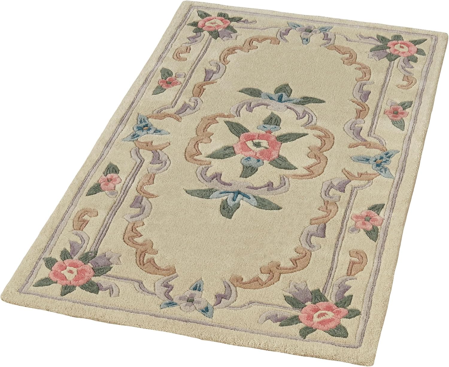 Timeless tradition, along with a sweet elegance, graces the Serena Aubusson II Rug with charming beauty. The luster-washed vintage-inspired wool rug, .5" thick, wears well and feels soft underfoot while looking beautiful in Parisian blue, neutral ivory, and soft pastel tones. The lovely hand-tufted Aubusson rug has an intricate array of roses, florals, acanthus leaves, and scrolls, all with added dimension from the handcarved detailing. Backing is cloth-covered latex. Due to the handcrafted nature, variations in design may occur. Imported. Overall, the traditional pure wool rectangle rug measures 22 inches x 34 inches (1'10"x2'10").Vacuum regularly. Do not vacuum with a beater bar machine. Rotate rug annually. For minor spills, clean immediately by blotting with a cloth or sponge. We recommend professional cleaning by a rug cleaner. We also recommend the use of a rug pad to protect the rug and the underlying surface and to prevent color transfer. To help protect the backing, roll the rug when storing; do not fold. To help prevent fading, do not place the rug in areas of direct sunlight. For rugs used over carpeting, do not conduct any cleaning prior to removing the rug, and do not return the rug until completely dry.