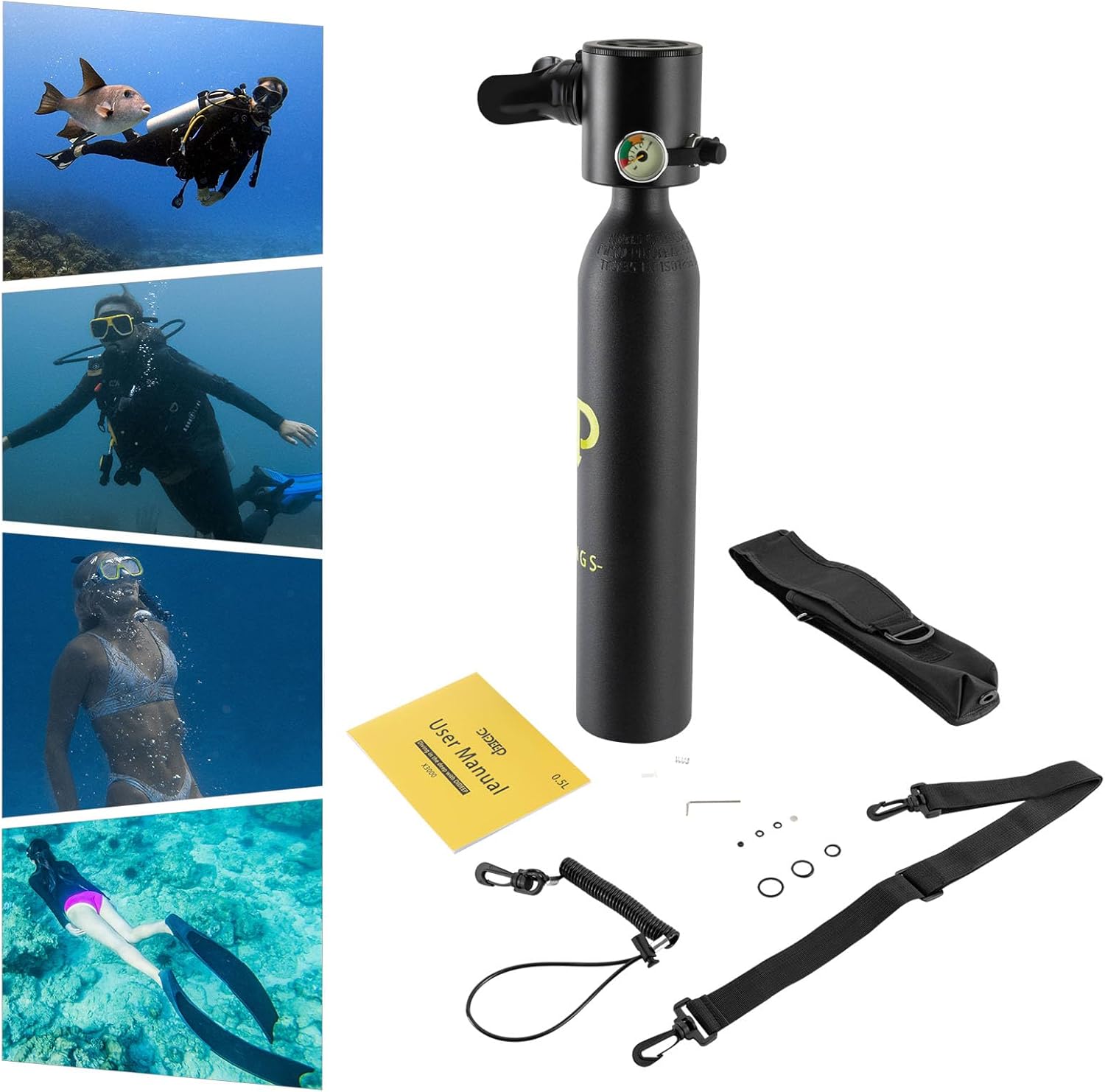Scuba Tank for Diver Mini Diving Tank Mini Scuba Tank Breath Underwater Device Scuba Cylinder with 5-10 Minutes Diving Oxygen Tank Inflatable Scuba Diving Equipment Provide A Underwater World TourSpecificationsColor: BlackMaterial: Aluminum Alloy, SiliconeProcesses: Spray Painting, Mirror Finish, Hot Extrusion, Integrated Molding, Hard Anodizing, Salt SprayShape: CylinderStyle: ModernSport Type: Outdoor LifestyleCylinder Capacity: 0.5L/0.13Gal/16.9OzGas Capacity(Compressed Air): 100L/26.4GalUse Time: 5-10 MinutesRespiratory Rates: 66 Sleep BreathsDiving Depth: 10m/33ft(Recreational Diving), 30m/100ft(Backup Gas Source for Professional Divers)Maximum Pressure: 20PMA/200BAR/3000PSIPressure Gauge: 0-300BarInflatable Head: 8mm/0.3inchBreathing Valve Top Diameter: 5.7cm/2.24inchScuba Tank Bottom Diameter: 6cm/2.36inchScuba Tank Height: 35.2cm/13.85inchNet Weight: 1kg/2.2 lbsGross Weight: 1.3kg/2.86 lbsPackage Size: 44*18*9cm/17.32*7.08*3.54inchHow to UseLink the atmospheric cylinder to the scuba tank.Tighten the pressure-relief screw.Link the respirator inflation interface.Open the valve of the scuba tank and wait until it is filled with 20MPa of gas, then close the valve.Unscrew the pressure-relief valve to relieve pressure.Pull out the respirator and finish inflation.Package Included1* Scuba Tank Body1* Breathing Valve1* Storage Bag1* Anti-loss Rope1* Strap1* English ManualOther Accessories for Assembly